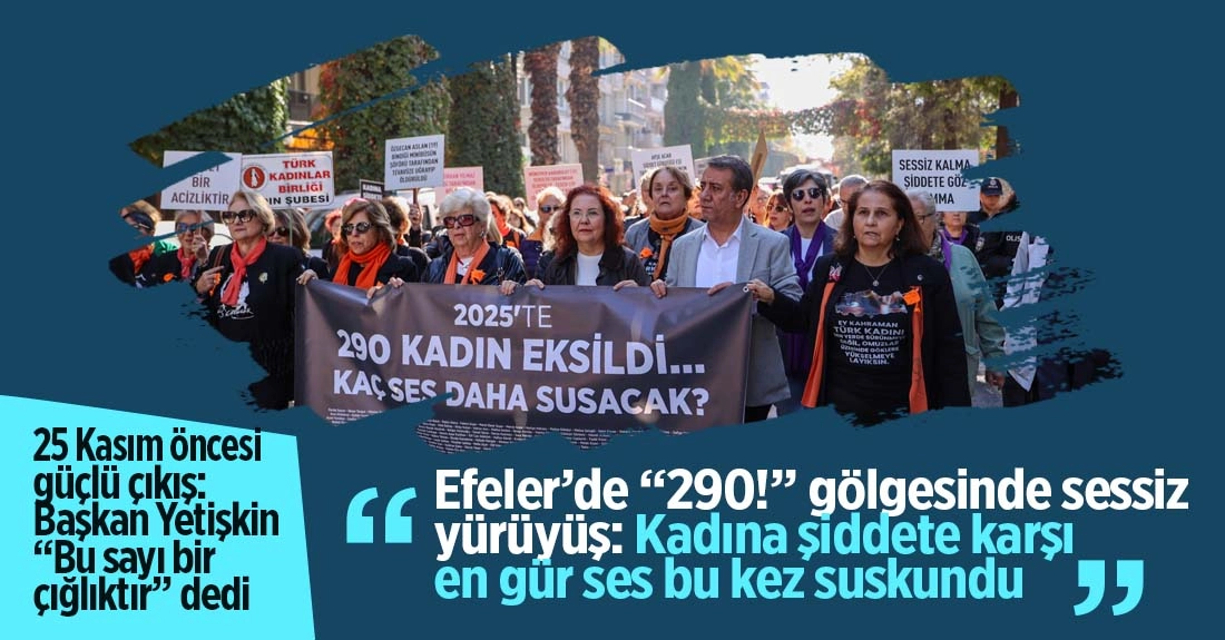 Efeler’de düzenlenen sessiz yürüyüş, kentin dört bir yanına asılan 290! mesajıyla birleşince, kadına yönelik şiddete karşı en gür protestelerden biri sessizlikle yükseldi.