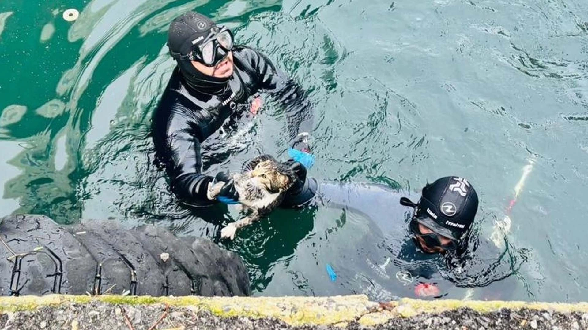 Mazgaldan düşerek iskele altına giren kedinin kurtarılması için iki kişilik su altı kurtarma timi suya girerken, iki kişilik ekip de botla destek verdi.