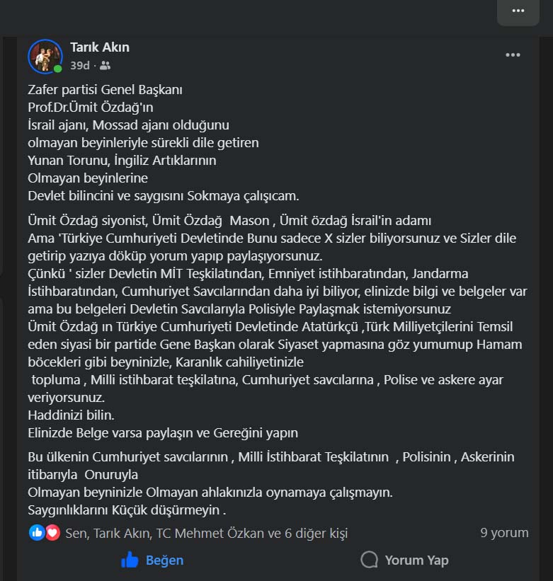 Zafer Partisi Aydın İl Başkanı Tarık Akın, sosyal medya üzerinden yaptığı açıklamayla Zafer Partisi Genel Başkanı Prof. Dr. Ümit Özdağ hakkında ortaya atılan iftira niteliğindeki iddialara yanıt verdi. Akın’ın paylaşımı kısa sürede siyasi gündemde geniş yankı uyandırdı.